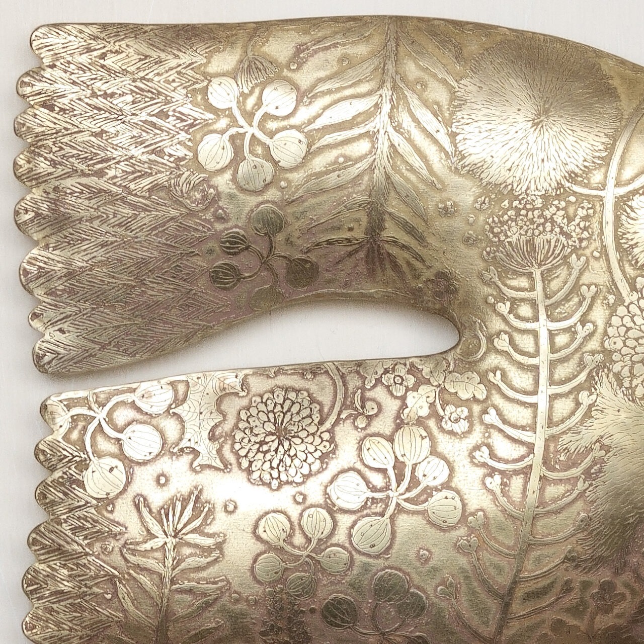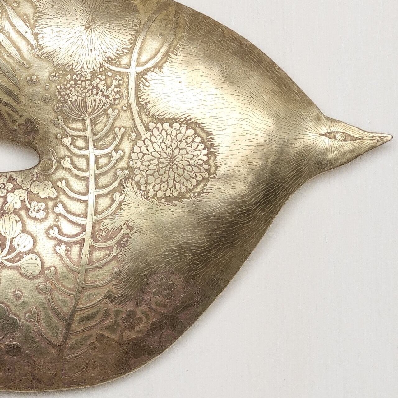 真鍮の塊に銅版画の技法でほどこした凹凸のあるデザインが特徴です。